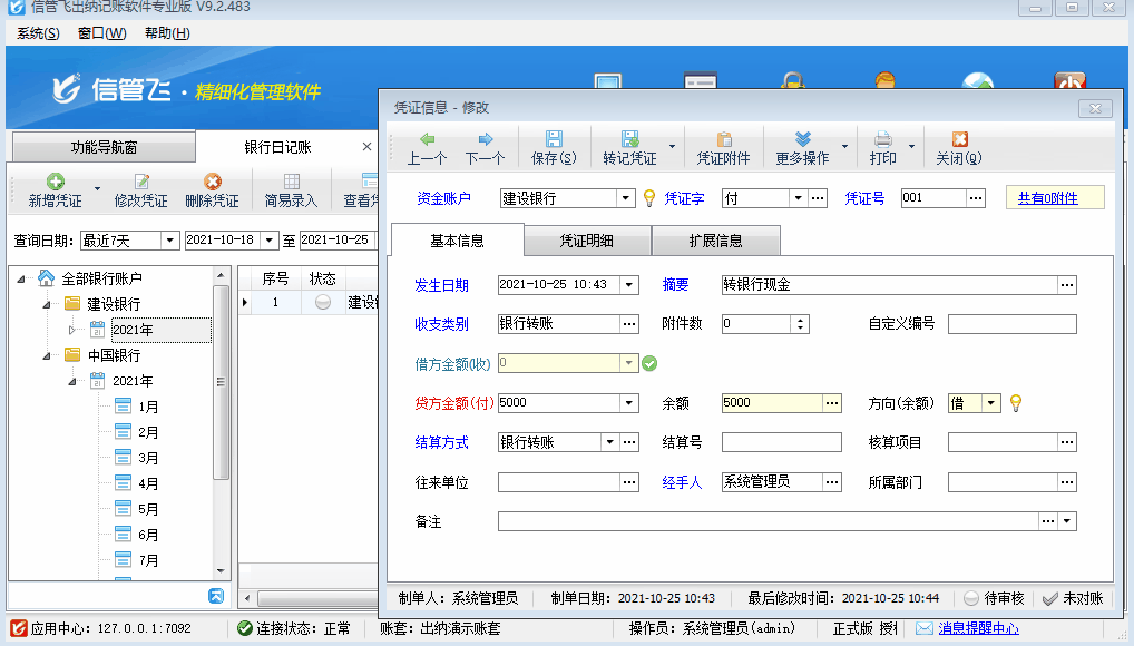 信管飛出納記賬軟件功能主要登記現金和銀行的日記賬,存在兩個銀行之間轉賬的情況,這種日記賬應該如何登記,本文針對此問題進行示范下如何操作。(示例:建設銀行轉賬中國銀行5000元) 首先登記建設銀行的日記賬,銀行資金轉出,日記賬需要登記憑證字為“付”的憑證記錄,摘要和收支類別可選擇轉銀行現金,如下圖所示: 內容輸入完成后,點擊“按鈕”,保存憑證后,在“轉記憑證”下選擇“保存憑證并記其他銀行賬—銀行轉賬”,會提示信息,點擊“確定”會彈出新的憑證新增界面。選