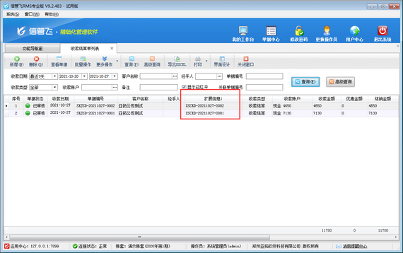 信管飛RMS支持管理往來應收應付款,支持對應收應付款進行收付款結算操作,方便用戶查看收付款情況。收付款結算單列表匯總顯示已開的所有的收付款結算單,如下圖所示,默認不可顯示收付款結算單結銷的相應應收款單據編號,本篇文章介紹一下如何設置收款結算單列表可查看相應應收款單據編號? 在功能導航窗選擇“系統管理”—》“系統參數配置”—》“業務參數”,進入業務參數設置界面,在“業務單據相關參數”中勾選“收付款結算單保存時提取明細中的單據編號到擴展信息數據項”參數,并設置參數值,默認為ext1(擴展信息1),然后保存參數配置,如下圖所示