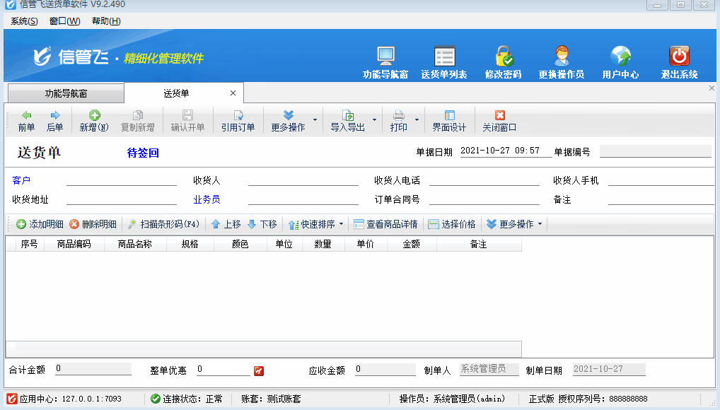 信管飛送貨單軟件是一款針對中小型企業開發的集送貨管理(發貨管理)、退貨管理(銷售退貨)、銷售收款(應收款管理)等功能為一體的簡單、易用的送貨管理及打印軟件,軟件支持把常用的商品提前錄入,開單支持直接選擇。對于一種商品存在多種規格的情況,軟件可在基礎資料商品信息規格中添加多種規格,開單的時候選擇此商品后規格可以選擇輸入。本文示范下如何操作? 演示視頻觀看鏈接:送貨單軟件如何設置多種規格可以開單選擇輸入演示視頻 在功能導航窗點擊“系統管理”—》“系統參數