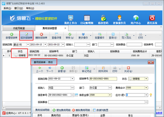 在日常工作中,因為臨時事件的發(fā)生,員工經(jīng)常會自己墊付工作所需要的各項費用。這些費用在月末時可以填寫費用報銷單進(jìn)行統(tǒng)一的報銷。信管飛出納記賬軟件專業(yè)版有費用報銷管理功能,可以管理費用報銷單。 演示視頻觀看鏈接:已審核的費用報銷單如何反審修改演示視頻 費用報銷單保存審核后默認(rèn)不允許直接修改,如下圖所示,但是部分客戶需要對已審核的費用報銷單進(jìn)行修改,軟件支持反審費用報銷單功能。本篇文章介紹一下出納記賬軟件中已審核的費用報銷單如何反審修改? 在功能導(dǎo)航窗點擊