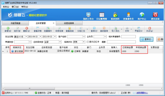信管飛出納記賬軟件可登記客戶和供應(yīng)商的應(yīng)收應(yīng)付款記錄,對于用戶出現(xiàn)部分收款的情況,軟件中如何處理?本文以“信管飛出納記賬軟件”為例進(jìn)行示范下如何部分結(jié)銷應(yīng)收款? 首先在往來管理中直接新增應(yīng)收款,在功能導(dǎo)航窗點擊“往來管理”—》“應(yīng)收款管理”中點擊工具欄的新增按鈕,可直接新增客戶的應(yīng)收款記錄,新增的應(yīng)收款記錄結(jié)銷狀態(tài)為未結(jié)銷狀態(tài),新增應(yīng)收金額為2590元。如下圖所示: 選擇“未結(jié)銷”狀態(tài)的應(yīng)收款,點擊工具欄的“收款結(jié)算”系統(tǒng)會彈出收款結(jié)算單界面。會默認(rèn)