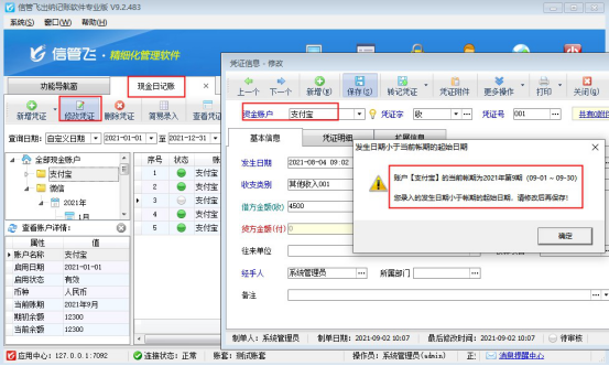 出納記賬軟件可登記日記賬,當本期(即本月)的業務已審核處理完畢,為避免后期打開修改造成數據不對的情況,軟件支持鎖定賬期,軟件可通過結賬處理,結賬后會自動進入下一賬期,已結賬的賬期憑證不允許修改,本文進行示范下如何操作? 在功能導航窗,點擊“出納管理”——》“出納期末結帳”,進入“出納期末結帳”界面,選擇賬戶名稱“支付寶”,可看到當前賬期是2021-8月,如下圖所示: 對資金賬戶“支付寶”進行結賬處理,選擇賬戶名稱為“支付寶”的記錄,點擊工具欄的“結賬”按鈕,系統
