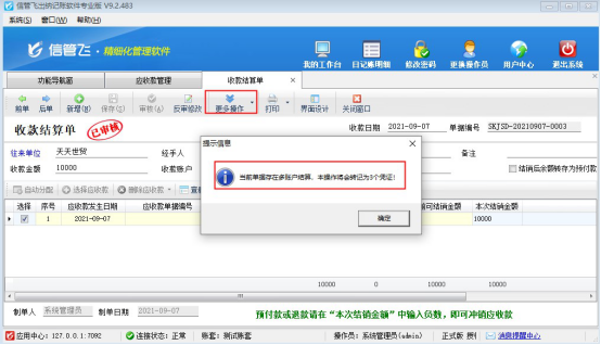 信管飛出納記賬軟件、信管飛RMS軟件等都支持管理往來賬,對應收應付款支持結算操作,有時存在一筆應收款多個資金賬戶結算的情況,針對此種情況,以“信管飛出納記賬軟件”為例,如何多賬戶結算? 在功能導航窗,點擊往來管理—》應收款管理,打開應收款管理界面。選擇一條未結銷的應收款,點擊工具欄的“收款結算”可彈出收款結算單界面。在收款結算單界面,打開收款賬戶,在多資金賬戶中輸入實際收款金額,多賬戶相加金額等于本筆應收款金額,然后自動分配,保存審核結算單,多賬戶結算完成,如下圖所示: &n