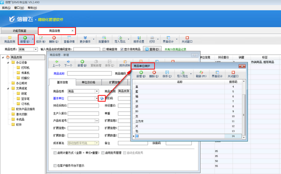 信管飛RMS軟件(星光版、標準版和專業版)可以對商品信息進行管理,支持自定義維護商品單位。以信管飛RMS專業版為例,本篇文章詳細介紹一下信管飛RMS軟件如何維護商品單位? 在信管飛RMS軟件中可通過對商品信息的新增或修改對商品單位進行維護。在功能導航窗點擊“基礎資料”—》“商品信息”,商品信息界面點擊“新增”或者“修改”。新增或者修改商品窗口,點擊“基本單位”后面的 圖標按鈕,系統彈出“商品單位維護”窗口,可以進行新增、刪除、導入、導出商品單位信息等操作,最后點擊“保存”按鈕進行保存即可。如下圖所示:圖1新增商品信息窗