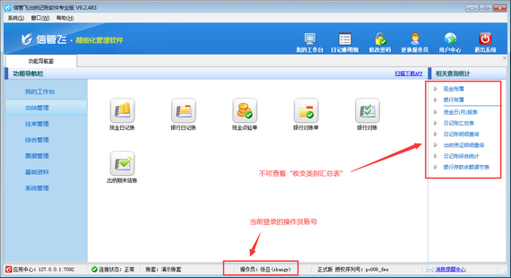 信管飛出納記賬軟件內包含豐富的記賬統計報表,如現金賬簿、銀行賬簿、資金日(月)報表、收支類別匯總表等。如果不希望員工賬號登錄后查看到這些報表,如何設置呢?本篇文章以信管飛出納記賬軟件專業版為例演示一下出納記賬軟件內如何設置操作員不可查看收支類別匯總表? 登錄軟件,在功能導航窗點擊“系統管理”—》“操作員及授權”,進入“操作員管理及授權”界面,選擇操作員“張亞”,在其右側的功能模塊權限內選擇“出納查詢”模塊,將收支類別匯總表的“使用”權限勾選取消,然后保存設置,如下圖所示。 操作員權限設