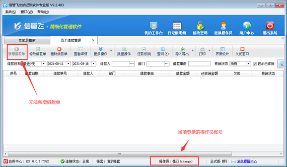 信管飛出納記賬軟件專業版的員工借款管理及還款管理可以對企業員工借款、還款進行流程化登記管理,提高了企業管理效率。本篇文章介紹一下出納記賬軟件如何設置操作員不可登記員工借款? 演示視頻觀看鏈接:出納記賬軟件如何設置操作員不可登記員工借款演示視頻 登錄軟件,在功能導航窗點擊“系統管理”—》“操作員及授權”,進入“操作員管理及授權”界面,選擇操作員“張亞”,在其右側的功能模塊權限內選擇“綜合管理”模塊,將員工借款管理的“新增”權限勾選取消,然后保存設置,如下圖所示。 &