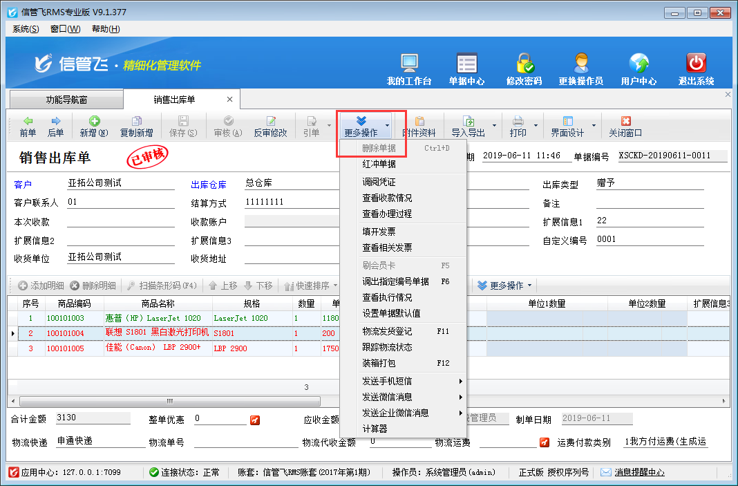 業(yè)務(wù)單據(jù)已審核后默認(rèn)是不允許刪除的,如果需要?jiǎng)h除,需要先紅沖此單據(jù),然后在刪除,即可刪除成功,在單據(jù)界面工具欄點(diǎn)擊“更多操作”—》“紅沖單據(jù)”即可紅沖單據(jù),如下圖所示。