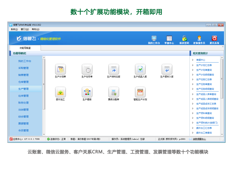在日新月異的商業(yè)環(huán)境中,企業(yè)的每一步發(fā)展都離不開(kāi)高效、精準(zhǔn)的管理系統(tǒng)支持。信管飛RMS軟件,作為行業(yè)領(lǐng)先的企業(yè)資源管理軟件,不僅穩(wěn)固了其在財(cái)務(wù)管理、進(jìn)銷(xiāo)存管理等核心領(lǐng)域的領(lǐng)先地位,更以開(kāi)放的姿態(tài),擁抱變化,創(chuàng)新性地支持另外擴(kuò)展十幾種功能,包括但不限于生產(chǎn)管理、委外加工管理、倉(cāng)庫(kù)掃碼、地磅稱(chēng)重以及塑編功能等,全方位助力企業(yè)實(shí)現(xiàn)數(shù)字化轉(zhuǎn)型,開(kāi)啟管理新篇