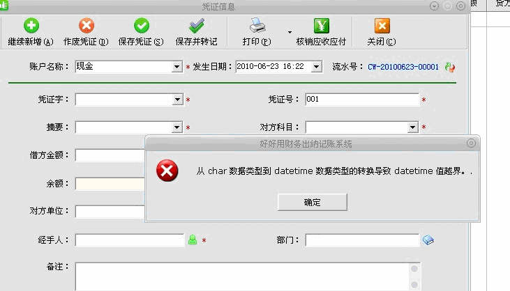 首次下載安裝好好用財務出納記賬系統,在“現金日記賬”或“銀行日記賬”功能中,點擊“新增憑證”進行憑證錄入時,如果出現下圖所示錯誤: