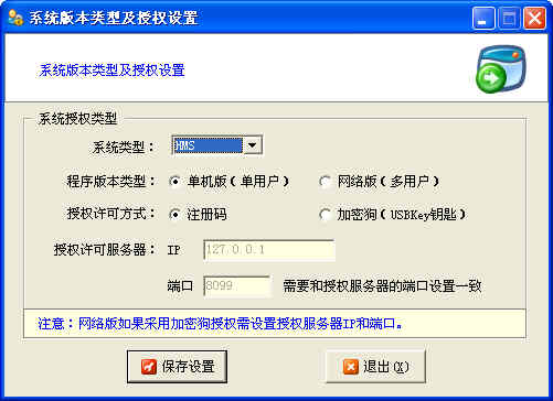 系統版本類型及授權類型設置工具,可以更改亞拓軟件產品的授權類型。主要包括程序版本類型:單機版(單用戶)、網絡版(多用戶);授權許可方式:注冊碼版、加密鎖(USB key);授權許可服務器IP地址及端口號。