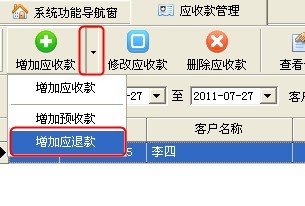 在“業(yè)務(wù)處理”-》“應(yīng)收款管理”中,點“增加應(yīng)收款”按鈕旁邊的小箭頭,系統(tǒng)會彈出下拉菜單,點擊其中的“增加應(yīng)退款”菜單項,系統(tǒng)彈出應(yīng)退款錄入界面。如下圖所示: