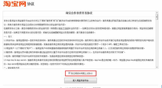提交后,點(diǎn)擊“進(jìn)入開發(fā)者中心”或者點(diǎn)擊網(wǎng)頁右上角的“我的控制臺”——》“開發(fā)者中心”。同意淘寶開放平臺協(xié)議。