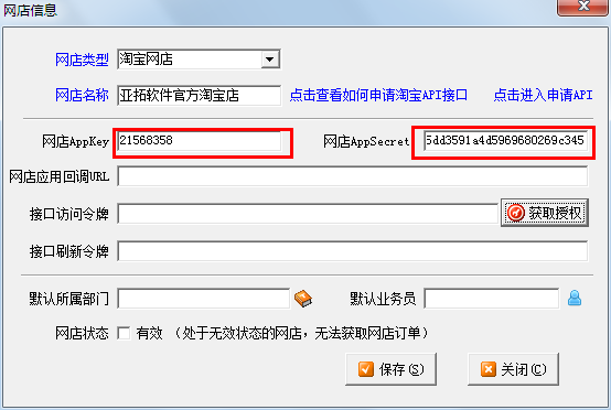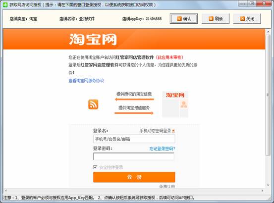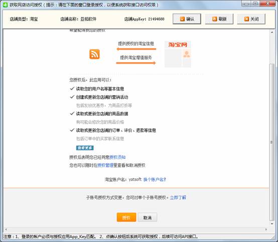 在“網(wǎng)店信息”窗口點(diǎn)擊 “獲取授權(quán)”按鈕進(jìn)行測試,注意由于目前淘寶API的限制,淘寶3鉆以下店鋪申請的API的授權(quán),24小時(shí)就會過期,屆時(shí)需要重新登錄一下(系統(tǒng)在授權(quán)失效時(shí)會彈出授權(quán)窗口,登錄一下即可)。