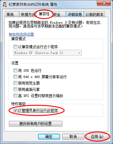 2、然后打開“兼容性”頁,復選“以管理員方式運行”,然后點“應用”按鈕。