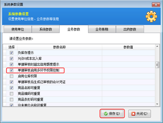 登錄亞拓管理軟件或者亞拓倉庫管理軟件,在功能導(dǎo)航窗點“系統(tǒng)管理”—》“系統(tǒng)參數(shù)配置”—》“業(yè)務(wù)參數(shù)”,勾選“單據(jù)審核啟用多環(huán)節(jié)權(quán)限控制”,點擊“保存”按鈕,如圖1所示。