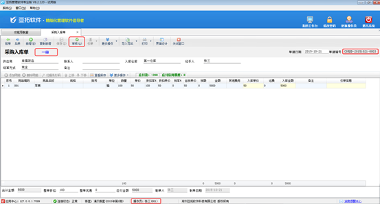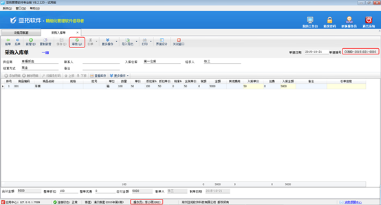 操作員“張三”登錄亞拓管理軟件,開過采購入庫單進行保存審核,審核后單據(jù)狀態(tài)變?yōu)椤耙粚彙保鐖D4所示。