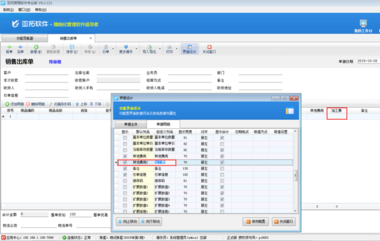 亞拓管理軟件提供靈活的界面自定義功能,用戶可根據自身業務要求對軟件界面進行設置,包括配置數據項名稱、啟用擴展數據項、顯示先后順序、設置顯示寬度、對齊方式、是否必填、取值方式及取值設置。