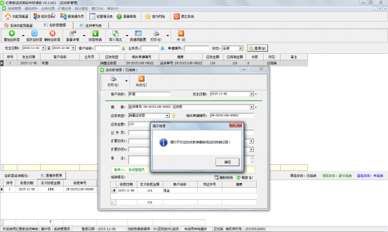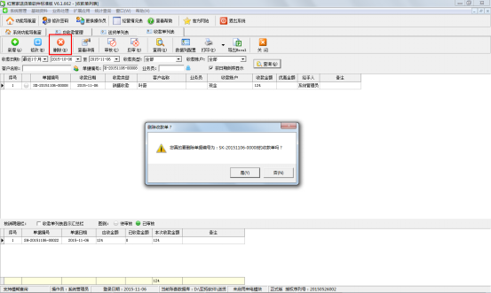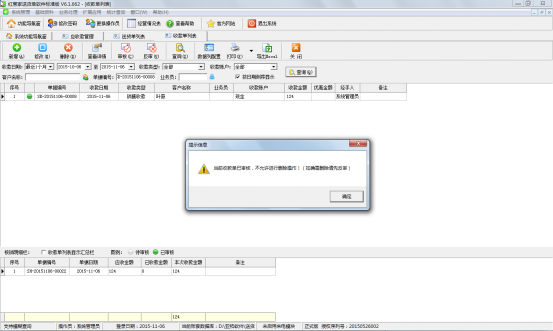 如果相應(yīng)的收款單已經(jīng)審核過了,此時(shí)刪除時(shí),系統(tǒng)會(huì)提示“當(dāng)前收款單已審核,不允許進(jìn)行刪除操作!(如確需刪除請(qǐng)先反審)”,如下圖五所示。