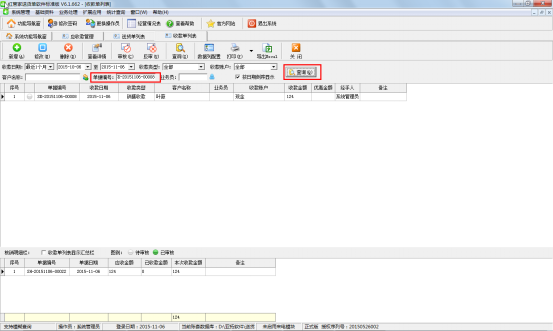 將收款單的單據(jù)編號(hào)記下之后,可以回到功能導(dǎo)航窗頁面,點(diǎn)擊“業(yè)務(wù)處理”—》“收款單列表”,在收款單列表頁面選擇收款日期并輸入我們剛剛記錄的收款單單據(jù)編號(hào)進(jìn)行查詢,將我們此前核銷錯(cuò)誤的那張收款單單據(jù)查詢出來,如圖三所示。