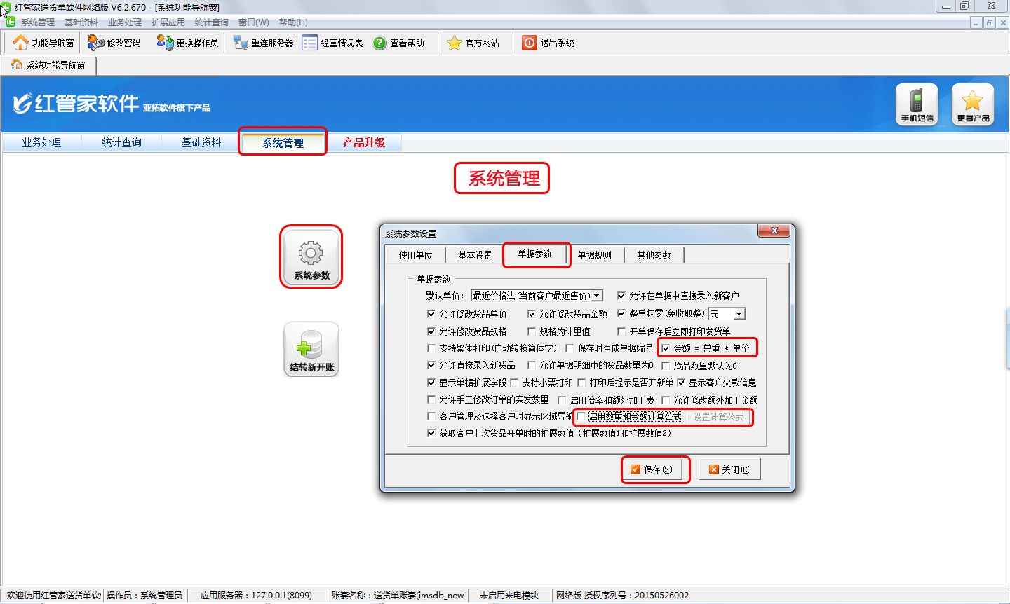 首先打開功能導航窗,點擊“系統管理”—》“系統參數”—》“單據參數”,將默認復選的“啟用數量和金額計算公式”選項打勾取消,然后打勾選中“金額=總重*單價”選項啟用按重量計算金額,配置完之后點擊“保存”按鈕保存剛剛所做的配置,如下圖一所示。