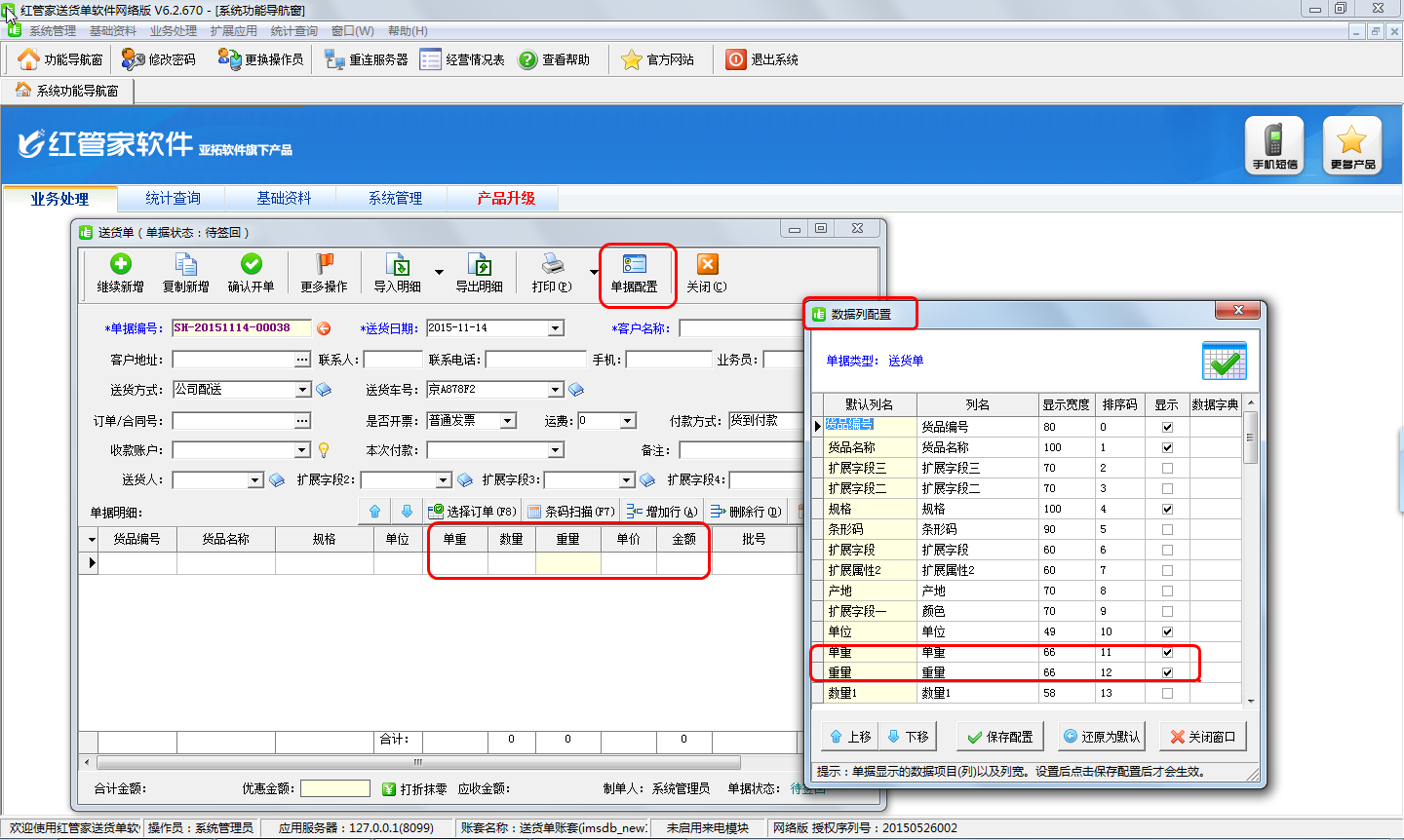 另外在開單頁面點“單據配置”,會彈出數據列配置界面,在數據列配置頁面中將“單重”、“重量”打勾顯示出來,下圖以新開送貨單界面為例截圖說明。