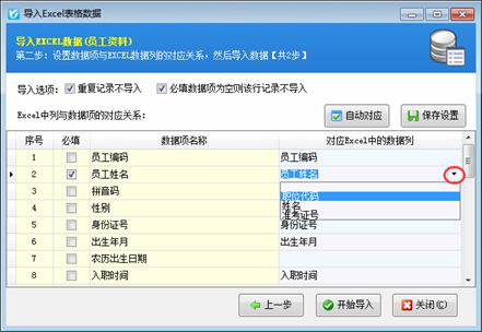 3、配置數據項與Excel中數據列的對應關系:點“下一步”按鈕配置“數據項”與Excel中的數據列之間的對應關系。點“自動對應”軟件會自動根據數據項名稱和數據列列名是否相同進行自動匹配。也可以按照下圖5所示手工選擇對應關系。