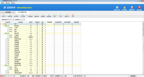 登錄亞拓管理軟件專業版,在功能導航窗點擊“基礎資料”—》“會計科目”,即可進入會計科目管理界面,如圖1所示。