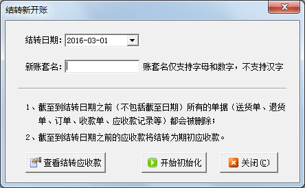 進(jìn)行結(jié)轉(zhuǎn)新開賬后軟件會(huì)新建一個(gè)賬套,之前的賬套還是會(huì)存在的。結(jié)轉(zhuǎn)后截止到結(jié)轉(zhuǎn)日期之前(不包括截至日期)所有的單據(jù)(送貨單、退貨單、訂單、收款單、應(yīng)收款記錄等)都會(huì)被刪除;截止到結(jié)轉(zhuǎn)日期之前的應(yīng)收款將結(jié)轉(zhuǎn)為期初應(yīng)收款,如果你需要查看之前的單據(jù)可以選擇原來的賬套進(jìn)行查詢,下面我們來演示一下具體的操作步驟。
