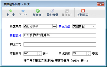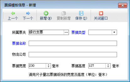 在“萬能票據打印”界面右側點擊“新增票據模板”按鈕,打開“新增票據模板”窗口,輸入模板信息后點擊“保存”按鈕即可在相應的票夾下新增票據模板。