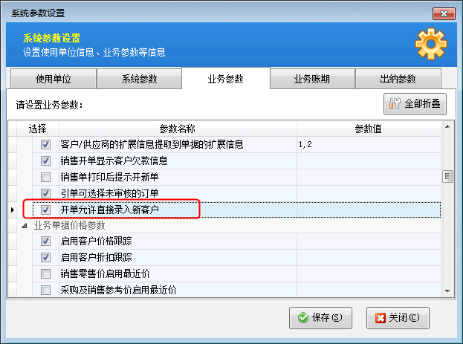 軟件中默認(rèn)是允許開單時直接錄入新客戶/供應(yīng)商的。如果該業(yè)務(wù)參數(shù)沒有被勾選,需要我們在使用此功能之前對相應(yīng)的業(yè)務(wù)參數(shù)進(jìn)行設(shè)置。在業(yè)務(wù)參數(shù)界面上我們將“開單允許直接錄入新客戶”勾選上,然后進(jìn)行保存。