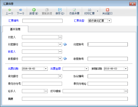 出票金額:必填項(xiàng),出票金額不能為0或?yàn)榭铡?BR> 到期日期:到期日期必須在出票日期之后,一般最長不超過6個(gè)月。