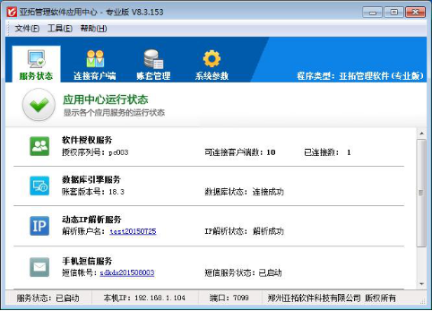 亞拓管理軟件、紅管家倉庫管理軟件和紅管家票據(jù)打印軟件都由客戶端程序和應(yīng)用中心程序兩部分組成,應(yīng)用中心可以全面掌控軟件的運(yùn)行情況,可以隨時(shí)查看各類服務(wù)的運(yùn)行狀態(tài),主要包括軟件授權(quán)服務(wù)情況、數(shù)據(jù)庫引擎服務(wù)情況、動(dòng)態(tài)IP解析服務(wù)情況、手機(jī)短信服務(wù)情況等。下面我們以亞拓管理軟件專業(yè)版為例介紹一下應(yīng)用中心的服務(wù)狀態(tài)。