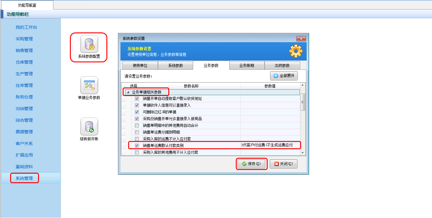 在功能導航窗點擊“系統(tǒng)管理”—》“系統(tǒng)參數(shù)配置”—》“業(yè)務(wù)參數(shù)”,即可進入到“業(yè)務(wù)參數(shù)”界面,在業(yè)務(wù)單據(jù)相關(guān)參數(shù)內(nèi)可以設(shè)置參數(shù)“銷售單運費默認付款類別”的參數(shù)值,此處設(shè)置為“3代客戶付運費(不生成運費應(yīng)付款,運費計入應(yīng)收金額)”,設(shè)置完點擊“保存”按鈕保存配置,如下圖一所示。