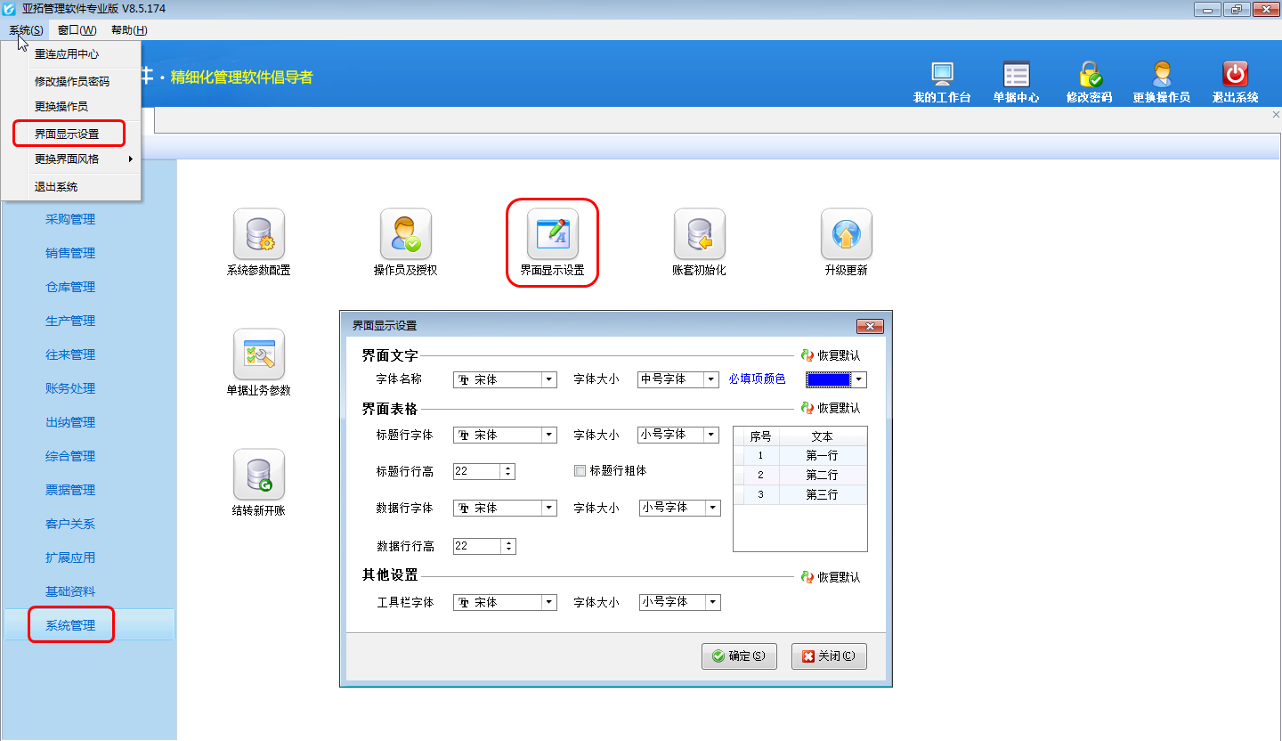 亞拓管理軟件(精細化管理軟件、進銷存管理軟件、記賬軟件)、紅管家送貨單軟件、紅管家倉庫管理軟件、紅管家票據打印軟件、紅管家出納記賬軟件中都可以對界面文字(界面文字僅對業務單據生效)以及界面表格字體大小進行設置,本篇文章以亞拓管理軟件專業版為例詳細介紹下在軟件內如何調整字體大小?