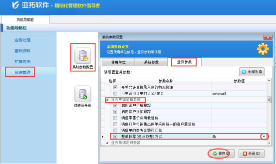 在左側(cè)的導(dǎo)航窗選擇“系統(tǒng)管理”—》“系統(tǒng)參數(shù)配置”的業(yè)務(wù)參數(shù),勾選上“整單抹零方式”,參數(shù)值默認(rèn)為“角”,可在后邊的下拉框修改參數(shù)值。如下圖1所示: