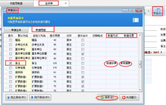 以送貨單軟件為例,示范下如何設(shè)置備注為選擇項(xiàng),首先打開一個(gè)送貨單,打開工具欄中的“界面設(shè)計(jì)”選擇“單據(jù)明細(xì)”中的備注項(xiàng)。取值方式選擇“數(shù)據(jù)字典”,取值設(shè)置選擇“常用摘要”,然后保存設(shè)置,如下圖所示: