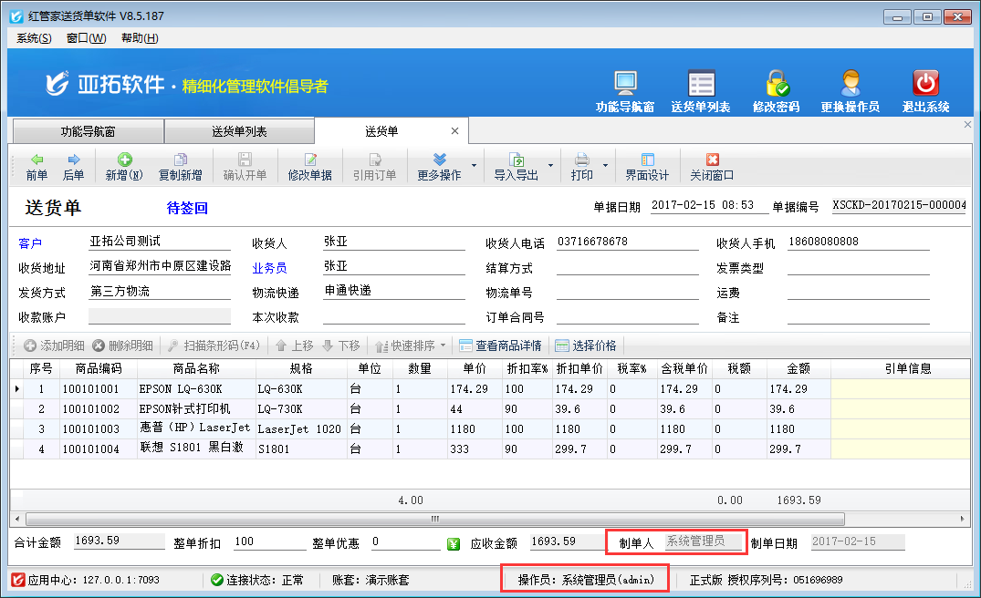 亞拓管理軟件、紅管家送貨單軟件、紅管家倉(cāng)庫(kù)管理軟件、紅管家出納記賬軟件、紅管家票據(jù)打印軟件等安裝后默認(rèn)登陸的操作員為“系統(tǒng)管理員”,開(kāi)單時(shí)“制單人”數(shù)據(jù)為當(dāng)前操作員名稱(chēng)(即“系統(tǒng)管理員”),部分用戶在使用軟件時(shí)需要將其修改為其他名稱(chēng),在軟件內(nèi)如何修改呢?本篇文章以紅管家送貨單軟件為例詳細(xì)介紹一下如何修改“制單人”名稱(chēng)?