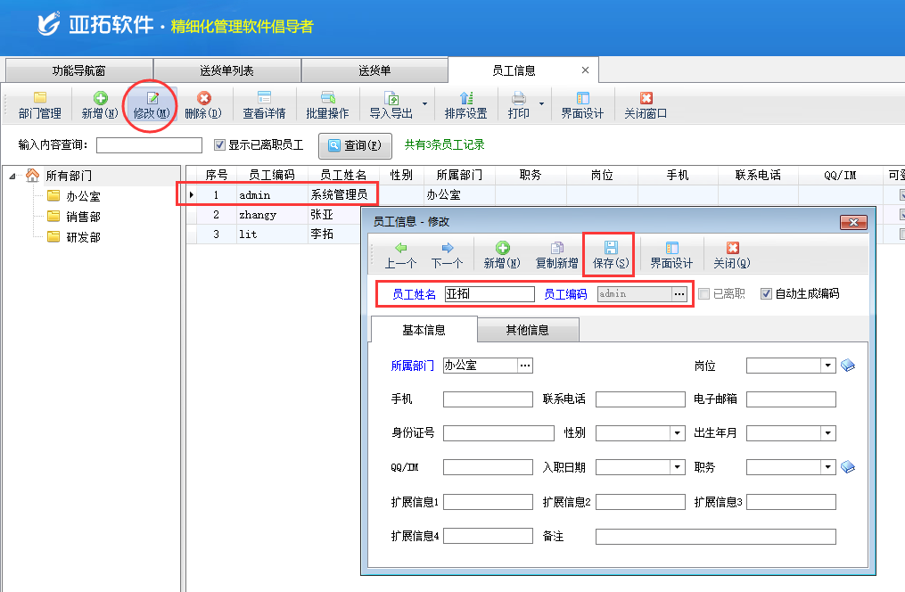 在功能導(dǎo)航窗點(diǎn)擊“基礎(chǔ)資料”——》“員工信息”,打開(kāi)員工信息主界面,選擇“系統(tǒng)管理員”修改資料并保存,如圖二所示中將“系統(tǒng)管理員”修改為“亞拓”,修改之后重新登陸軟件開(kāi)單時(shí),即可看到“制單人”已更改為“亞拓”,如圖三所示。