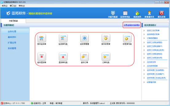 設置啟用的功能模塊保存后,可以看到業(yè)務處理界面顯示的功能圖標已經(jīng)隱藏了退貨模塊和訂單模塊,如圖3所示。