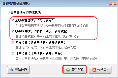 點擊“設置啟用的功能模塊”按鈕,系統(tǒng)彈出“設置啟用的功能模塊”窗口,如圖2所示,一共分為四個功能模塊組:應收款管理模塊、收款結算模塊、退貨模塊、訂單模塊。軟件默認顯示全部的功能模塊,現(xiàn)在我們只勾選應收款管理模塊和收款結算模塊,取消勾選退貨模塊和訂單模塊,然后點擊“保存設置”按鈕。