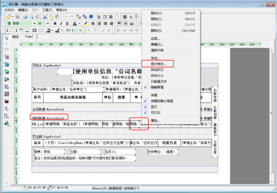 設置打印模板和單據界面一致,在開好的單據界面選擇“打印”—》“打印格式設計”—》“設計格式”,進入打印設計器界面,選擇細項數據的單價文本框,右鍵選擇“顯示格式”,如下圖所示: