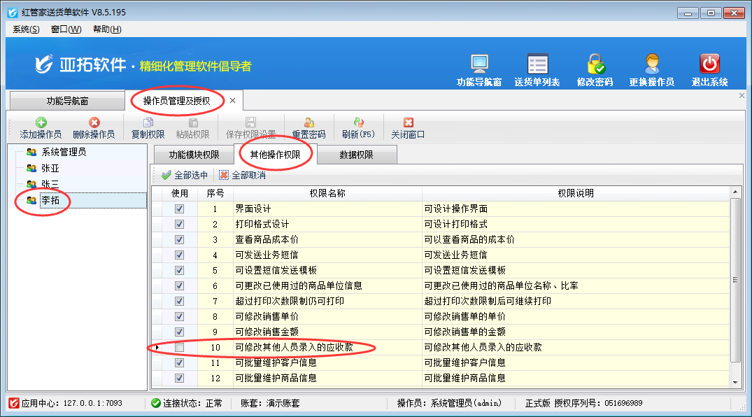 在功能導航窗點“系統管理”→“操作員及授權”即可進入“操作員管理及授權”界面,選中操作員賬號,在“其他操作權限”界面將“可修改其他人員錄入的應收款”權限打鉤取消,如下圖一所示,設置操作員賬號“李拓”不可修改其他人員錄入的應收款。