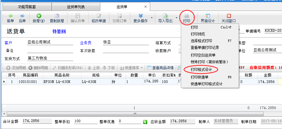 打印偏移是用于處理打印預覽時正確但是打印出來會整體錯位的情況,一般情況下是針式打印機打印頭起始位置導致,而不是打印格式模版的問題,此種情況下您只需要在打印時調整打印偏移量就可以的,另外軟件內也支持調整打印偏移量,打開一個已開的送貨單單據,選擇“打印”按鈕下的“打印格式設計”,進入打印格式設計界面,如下圖二所示。