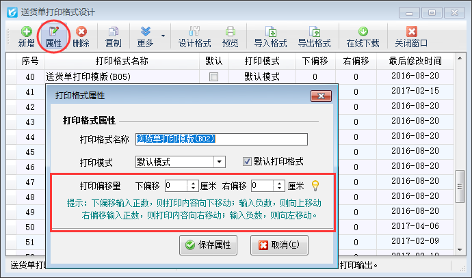 進入“打印格式設計”界面后,選擇需要使用的打印格式模版,點擊工具欄中的“屬性”按鈕或者右鍵選擇“屬性”,修改打印偏移量,偏移值可以根據尺子量的尺寸進行填寫(如下圖三所示),保存屬性之后偏移值會進行保存,之后再次打印時即可根據設置的偏移值來打印單據,如下圖四所示(相對于圖一打印內容整體向上、向右偏移后打印正常)。