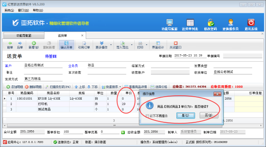 亞拓軟件開發的亞拓管理軟件、紅管家倉庫管理軟件、紅管家送貨單軟件等在開單據時如果商品單價為0,系統會彈出提示信息,是否需要繼續保存,如下圖一所示,這樣以免用戶在添加商品明細時忘了填寫單價,好及時錄入,但是有一部分用戶在開單據時只需要填寫商品數量,不需要填寫單價,那么該怎么設置系統才能不彈出以下提示信息呢?本篇文章以紅管家送貨單軟件為例介紹一下如何設置送貨單開單時商品單價為0系統不彈出提示信息?
