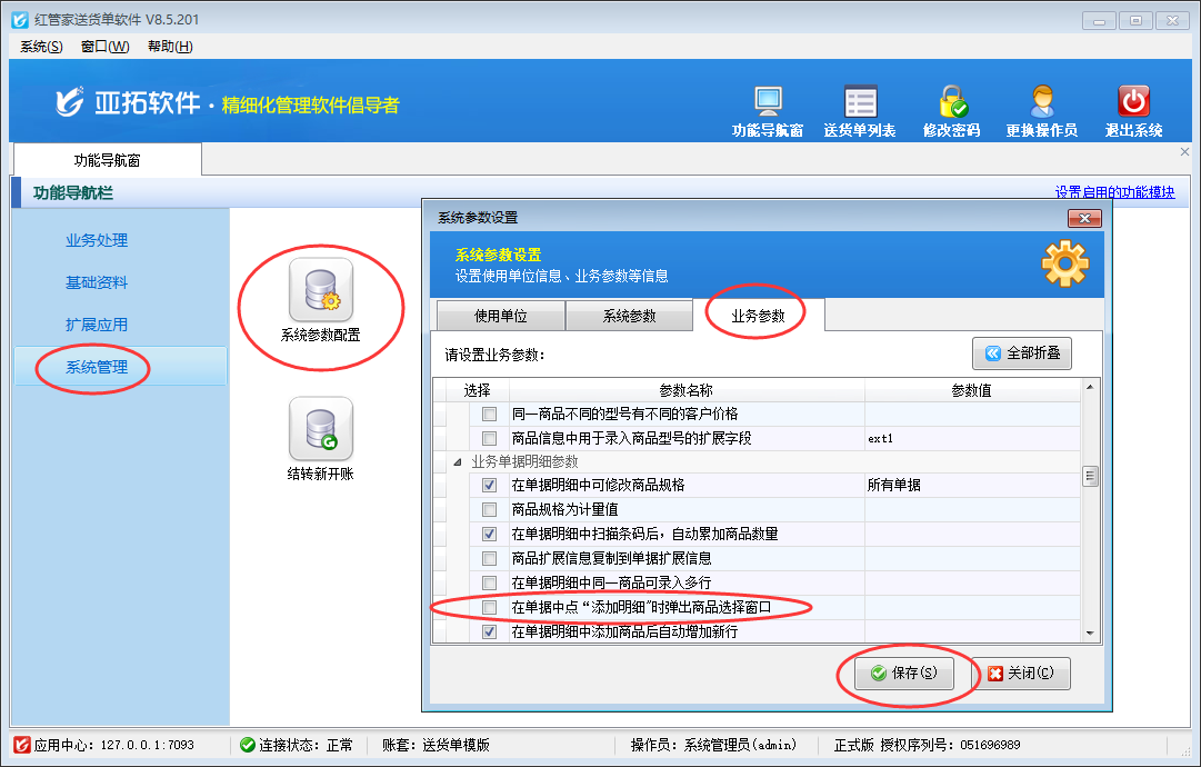 在功能導航窗點擊“系統管理”—》“系統參數配置”—》“業務參數”,即可進入到“業務參數”配置界面,在業務單據明細參數內找到“在單據中點擊‘添加明細’時彈出商品選擇窗口”參數,把這個參數的勾選去掉,然后保存,如下圖二所示。
