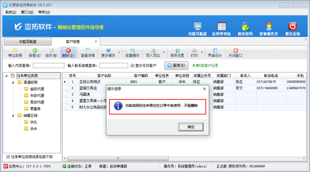 系統(tǒng)默認(rèn)在單據(jù)中已使用過的往來單位信息是不能刪除的,因?yàn)槿绻麆h除,則會(huì)影響之前已使用此往來單位信息所開的業(yè)務(wù)單據(jù),對(duì)于此種情況,我們可以將需要?jiǎng)h除的往來單位設(shè)置為無效,本篇文章我們來介紹送貨單軟件內(nèi)如何將客戶信息設(shè)置為無效?