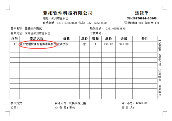 以送貨單軟件為例,示范下如何設置打印模板中文本框為自動折行。先新增一個送貨單,商品名稱為“亞拓標準版本單機版”正常開單后確認開單,預覽之前的模板,商品名稱過長顯示不全,如下圖1所示: