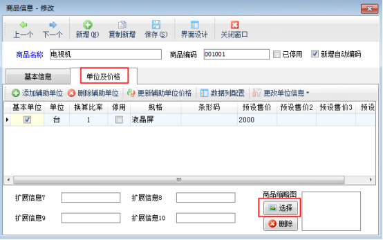 “商品信息修改”窗口點(diǎn)擊“單位及價(jià)格”,然后點(diǎn)擊“選擇”按鈕,可以選擇已準(zhǔn)備好的圖片,支持jpg、png等格式的圖片,建議圖片大小在100K以內(nèi),圖片大小過大會(huì)影響商品打開速度。選擇圖片后,點(diǎn)擊“保存”按鈕對(duì)商品信息保存,如圖2所示。如果需要更換商品圖片,可以點(diǎn)擊“刪除”按鈕刪除商品圖片,然后再?gòu)男律蟼鲌D片即可。