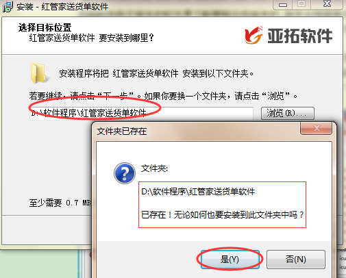 刪除后邊重復(fù)的內(nèi)容,點(diǎn)擊下一步,會(huì)提示文件夾中已存在軟件,是否繼續(xù)安裝在此文件夾,點(diǎn)擊“是”表示覆蓋安裝到之前的文件夾中。如下圖3所示: